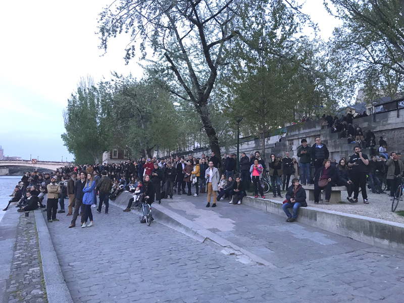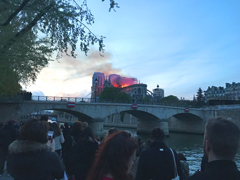 On 15 April 2019, just before 18:20 local time, a structure fire broke out beneath the roof of Notre-Dame de Paris cathedral in Paris. By the time it was extinguished, the building's spire collapsed and most of its roof had been destroyed and its upper walls severely damaged. Extensive damage to the interior was prevented by its stone vaulted ceiling, which largely contained the burning roof as it collapsed. Many works of art and religious relics were moved to safety early in the emergency, but others suffered some smoke damage, and some exterior art was damaged or destroyed. The cathedral's altar, two pipe organs, and its three 13th-century rose windows suffered little to no damage. Three emergency workers were injured. Contamination ( lead from the roof mainly, among other things ) of the site and the nearby environment resulted.