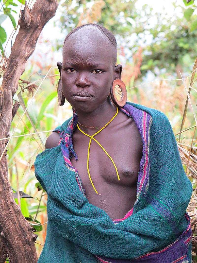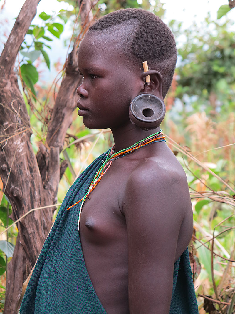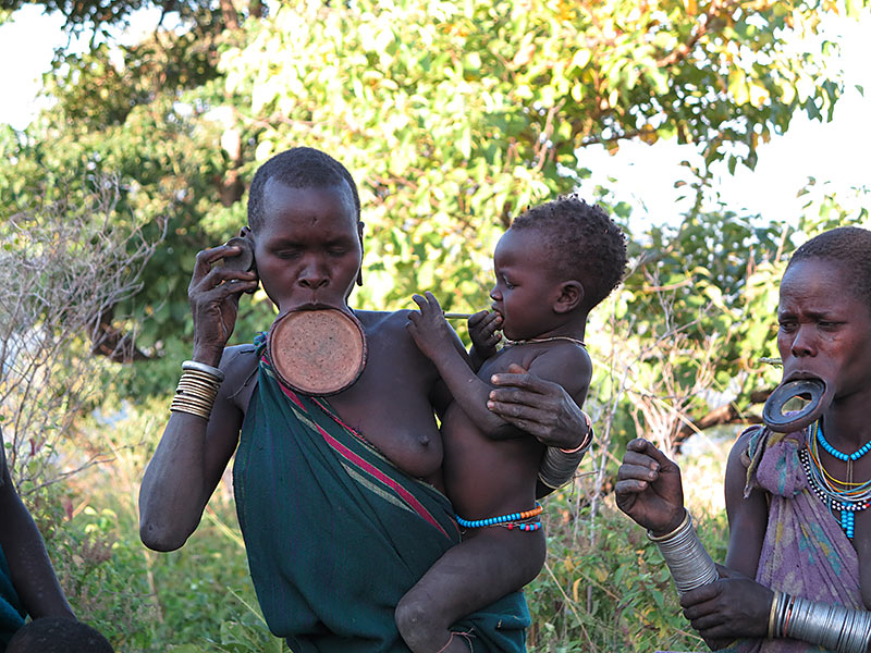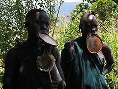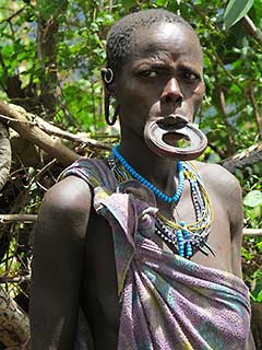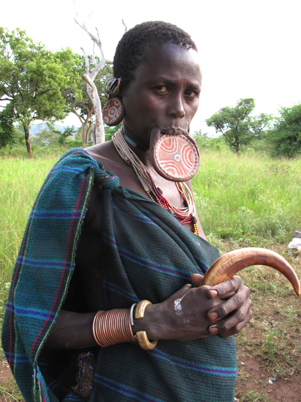 Percer lèvres et lobes d’oreilles pour y loger des petits plateaux constitue un rituel majeur de la culture Suri. Seules les femmes arborent les plateaux labiaux, ou "labrets". A la puberté, la plupart des jeunes femmes se font arracher quelques dents inférieures pour pouvoir ultérieurement placer le labret. Ensuite la lèvre inférieure est percée, et étirée pour accueillir des plateaux de taille croissante. Avoir la lèvre percée est un signe de beauté et de bonne conduite chez la femme; une croyance répandue veut que plus le plateau labial de la femme est large, plus sa dot en bétail sera importante ( selon d’autres, cette croyance n’est plus de mise ). Selon d’autres croyances, la coutume du port d’un plateau labial est liée au tabou du sexe oral. De nos jours, de plus en plus de jeunes femmes tentent de ne plus porter ces plateaux mais de nombreux hommes continuent de trouver les femmes plus attirantes avec leur plateau ancestral. Selon certains anthropologues, cette coutume trouverait son origine dans une volonté de rendre les femmes moins désirables aux marchands d’esclaves. Les labrets sont généralement faits de terre cuite ou de bois, mais si vous regardez attentivement nos photos, vous verrez une femme utiliser un petit seau bleu en plastique comme labret. Par curiosité, nous avons offert un CD à une femme pour qu'elle l'utilise comme labret et elle semblait très satisfaite, tout comme son ami masculin.