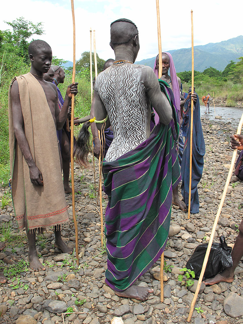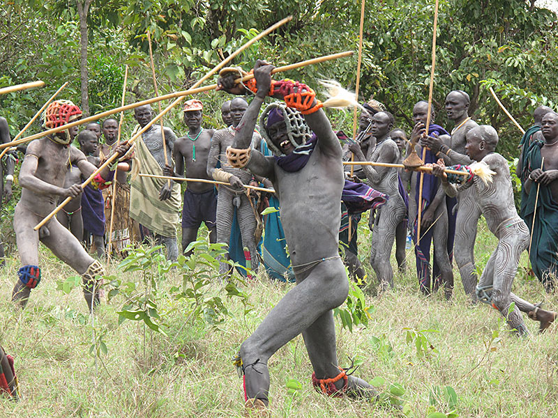 Le combat au bâton ou "Donga" : un sport et un rituel que les Suris pratiquent avec beaucoup de sérieux, un combat rituel avec de longs bâtons de bois. Chaque "équipe" est constituée uniquement de jeunes hommes célibataires désireux de montrer leur bravoure et d’obtenir ainsi le respect de leur famille et de leur village; il s’agit également d’un rite nuptial. Les combats opposent habituellement 2 villages durant la période la plus ardue de l’année, devant un large public, chacun des villages étant représenté par 20 à 30 combattants mûs par la volonté de combattre un adversaire du village rival. Ces affrontements prennent place sous les auspices de juges ou d’observateurs dont la mission est de veiller au bon respect des règles. Les jeunes hommes de chaque village se rendent sur le site de la Donga accompagnés de groupes de supportrices. Le vainqueur de chaque combat est autorisé à choisir sa préférée parmi les supportrices du village adverse. Chaque membre de l’équipe parie en quelque sorte sur les chances de ses sœurs ou cousines, nous sommes là vraiment dans un pur rite nuptial, dont la visée est de donner à chaque célibataire la possibilité de conclure une union avec d’autres célibataires de villages adverses. En regardant attentivement, on peut voir certaines jeunes filles supportrices faisant des gestes ou des sourires discrets à l’attention d’un combattant, pour lui signifier qu’elle souhaite être choisie par lui. Il n’est pas rare que certains combats s’achèvent dès les premiers coups échangés ( si un combattant tombe à terre, il est reconnu vaincu ), mais que ces combats peuvent être d’une violence extrême, avec parfois des morts, surtout à la suite de coups portés à l’estomac. Les hôpitaux ou dispensaires les plus proches sont au minimum à 170 kms des lieux de combat. Les blessures lors de ces combats pouvant être très sérieuses, et des morts pouvant survenir, la "Donga" a été officiellement abolie et déclarée illégale en 2010 par le gouvernement éthiopien.